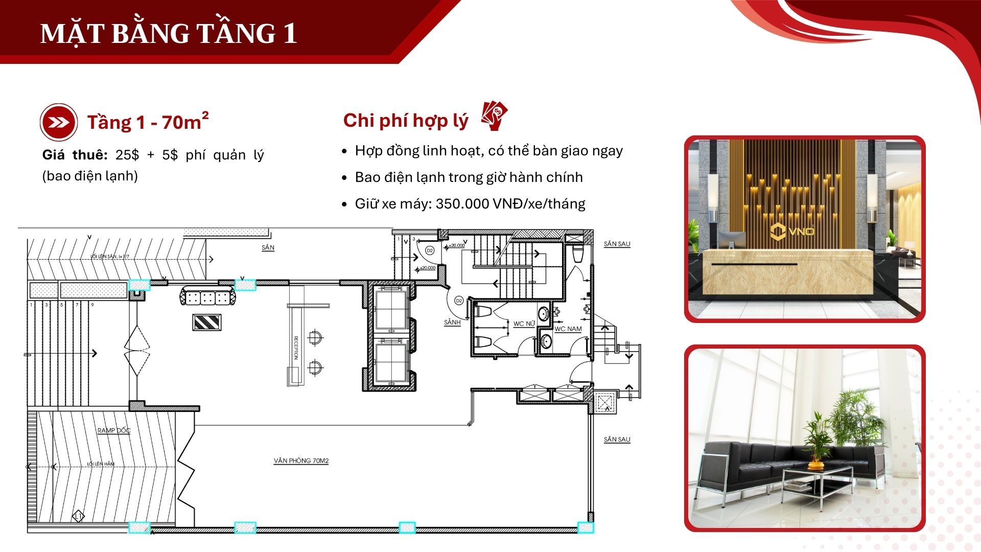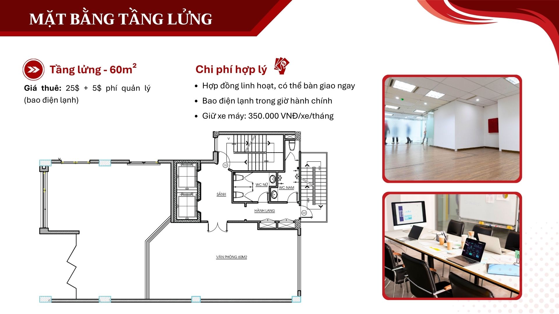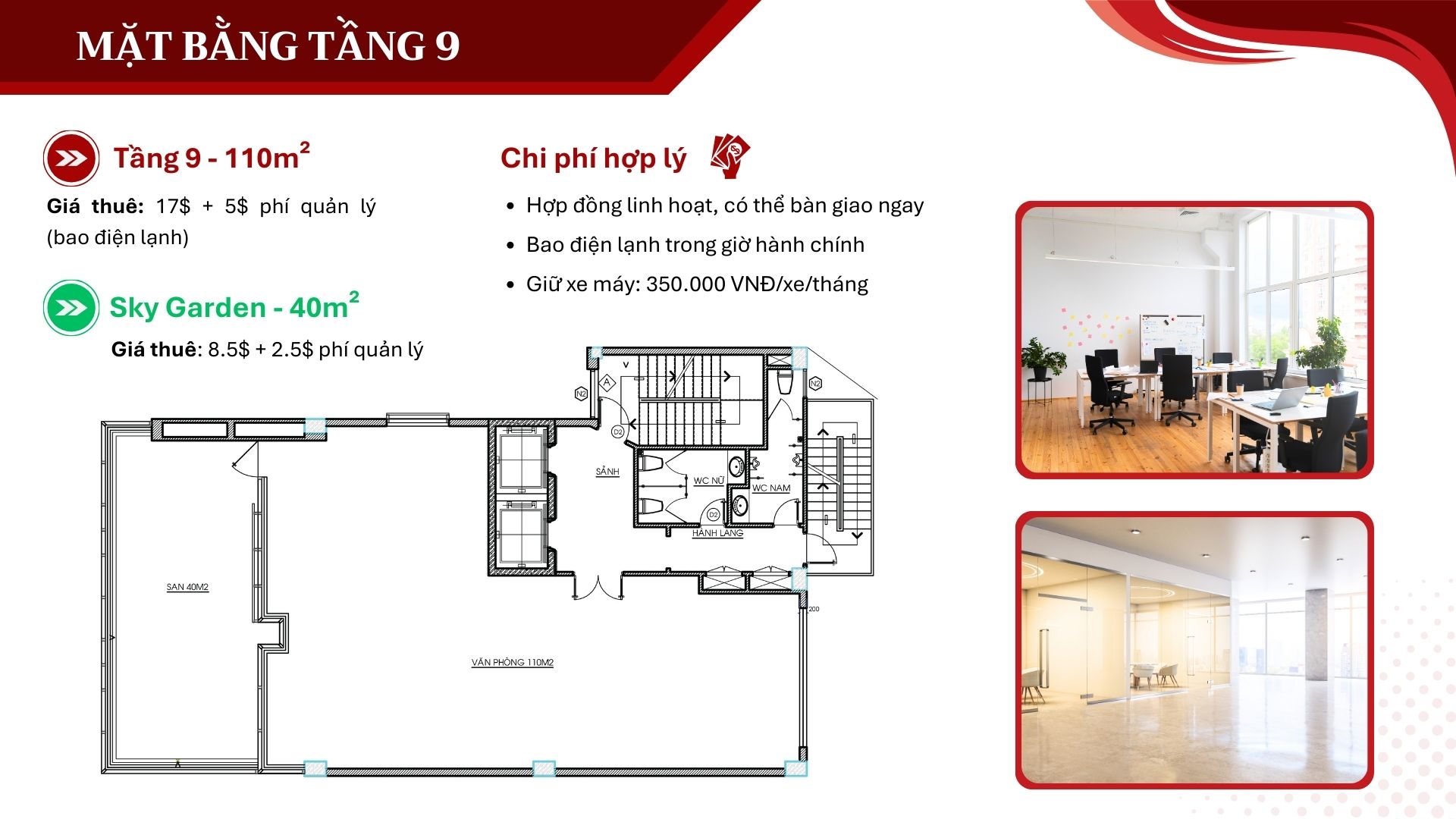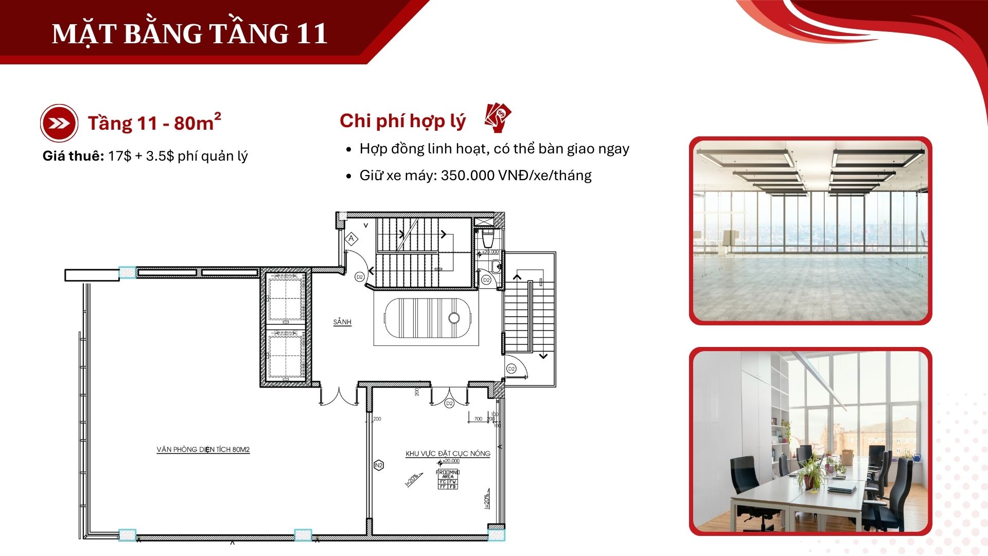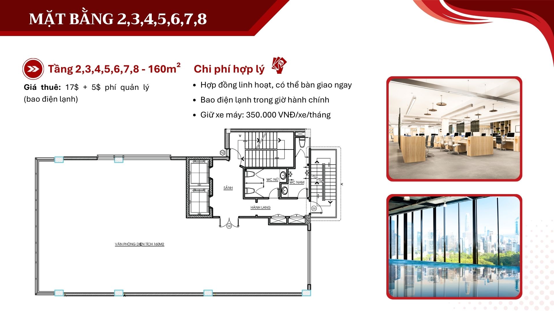 - Giá thuê chỉ từ 17$/m² + 5$ phí quản lý (bao điện lạnh giờ hành chính).